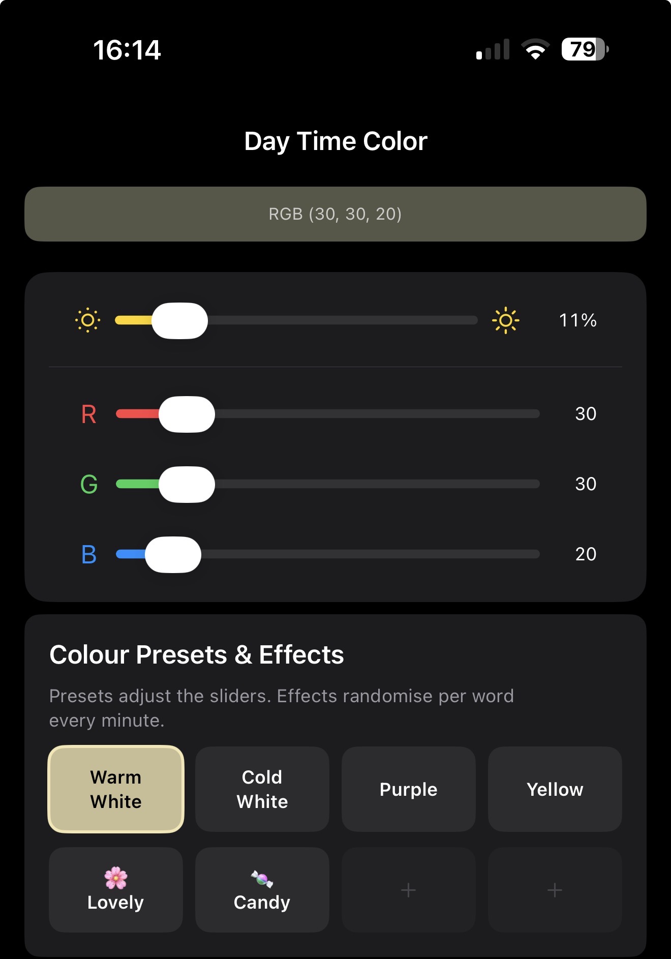 - Day Time Color (RGB Sliders): Passen Sie die globale Helligkeit sowie die Intensität von Rot, Grün und Blau in Echtzeit genau an.