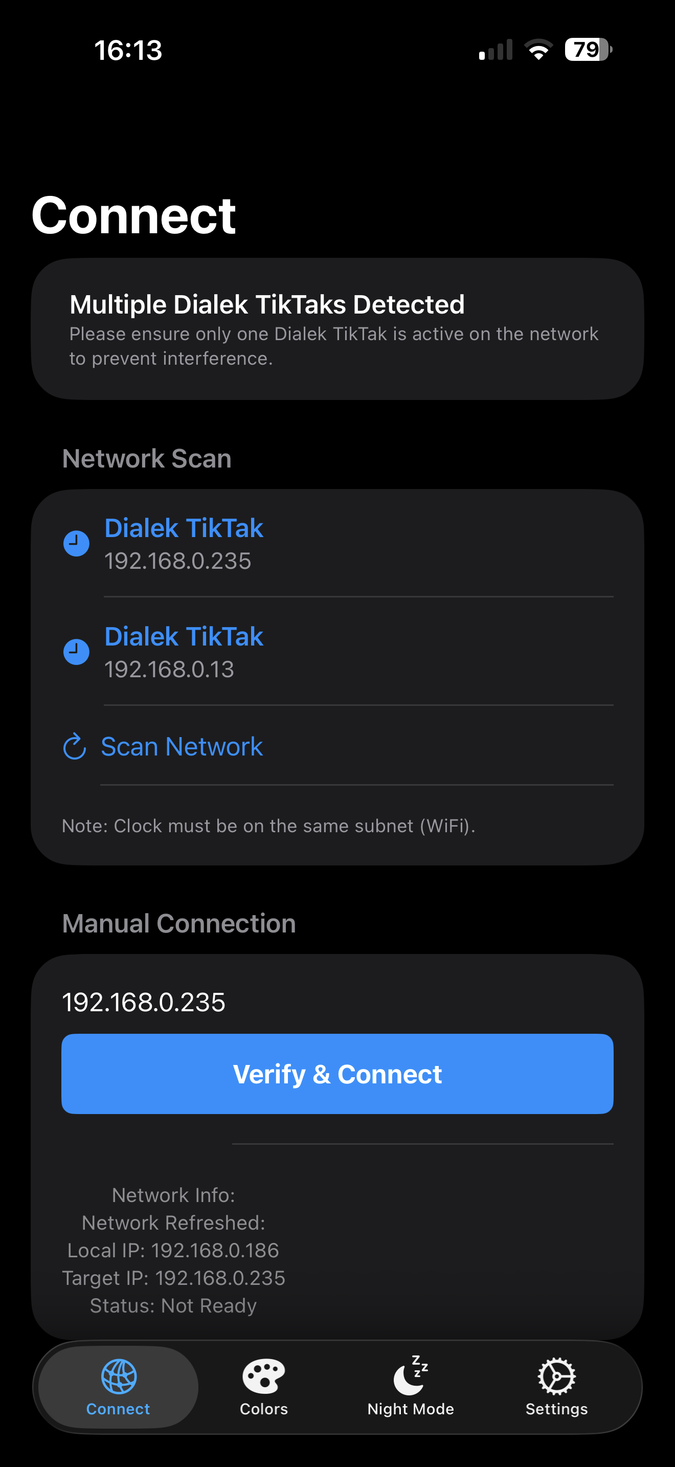 - Manual Connection: Wenn der Scan fehlschlägt, geben Sie die spezifische lokale IP-Adresse der Uhr hier ein (z.B. 192.168.0.235) und drücken Sie auf 'Verify & Connect'.