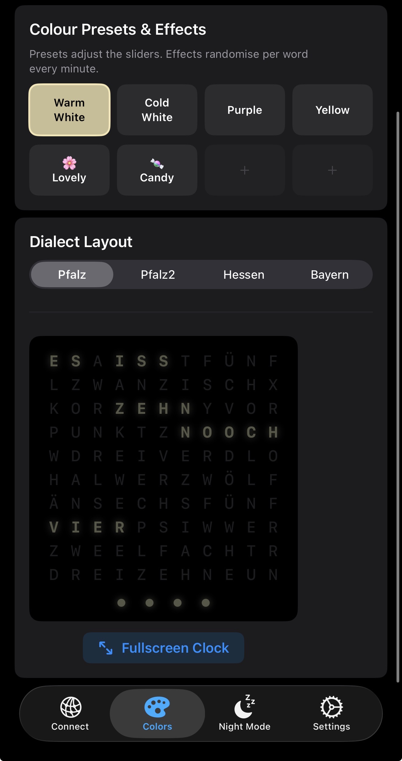 - Fullscreen Clock: Verwandelt den Bildschirm Ihres Telefons in einen Live-Emulator der physischen Uhren-Matrix.