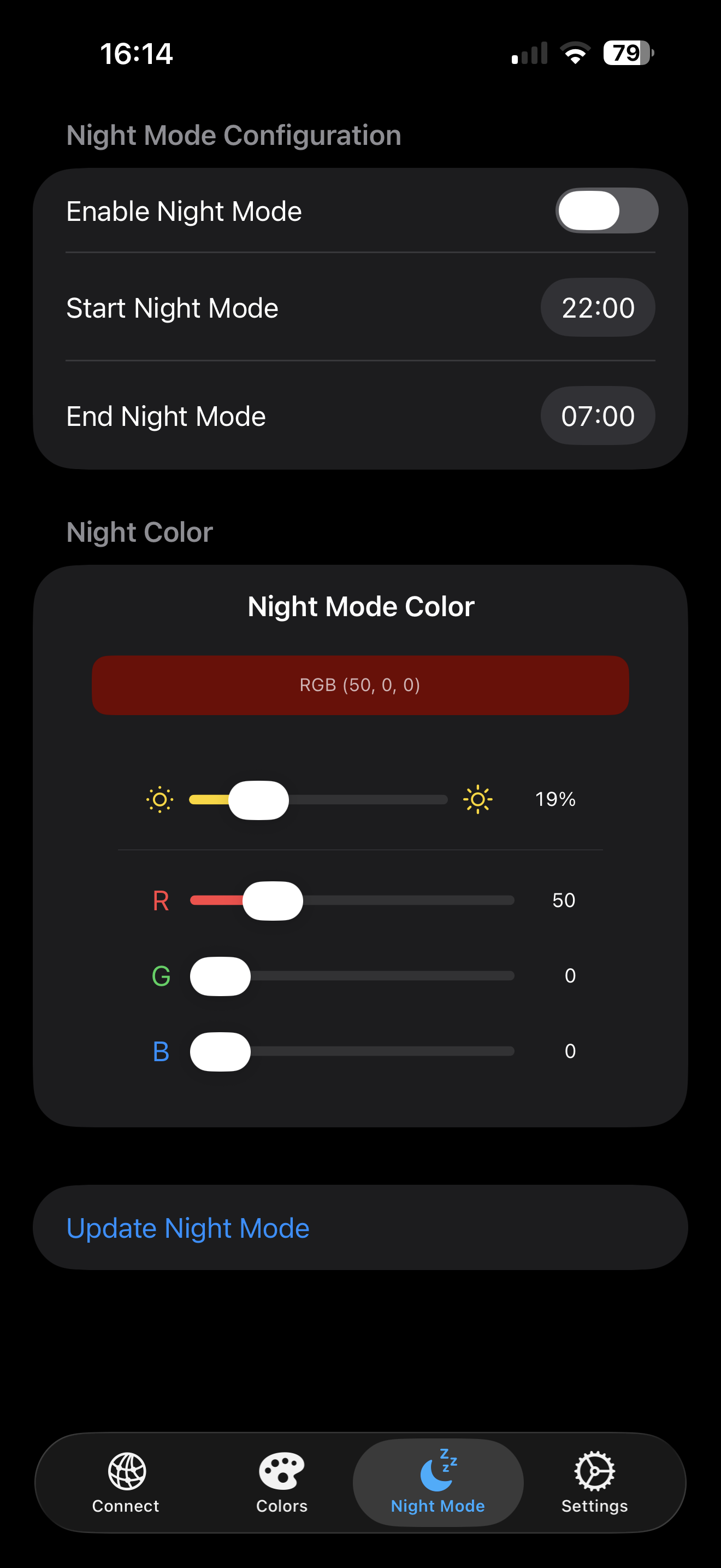 - Enable Night Mode: Schaltet den automatischen Zeitplan ein/aus.