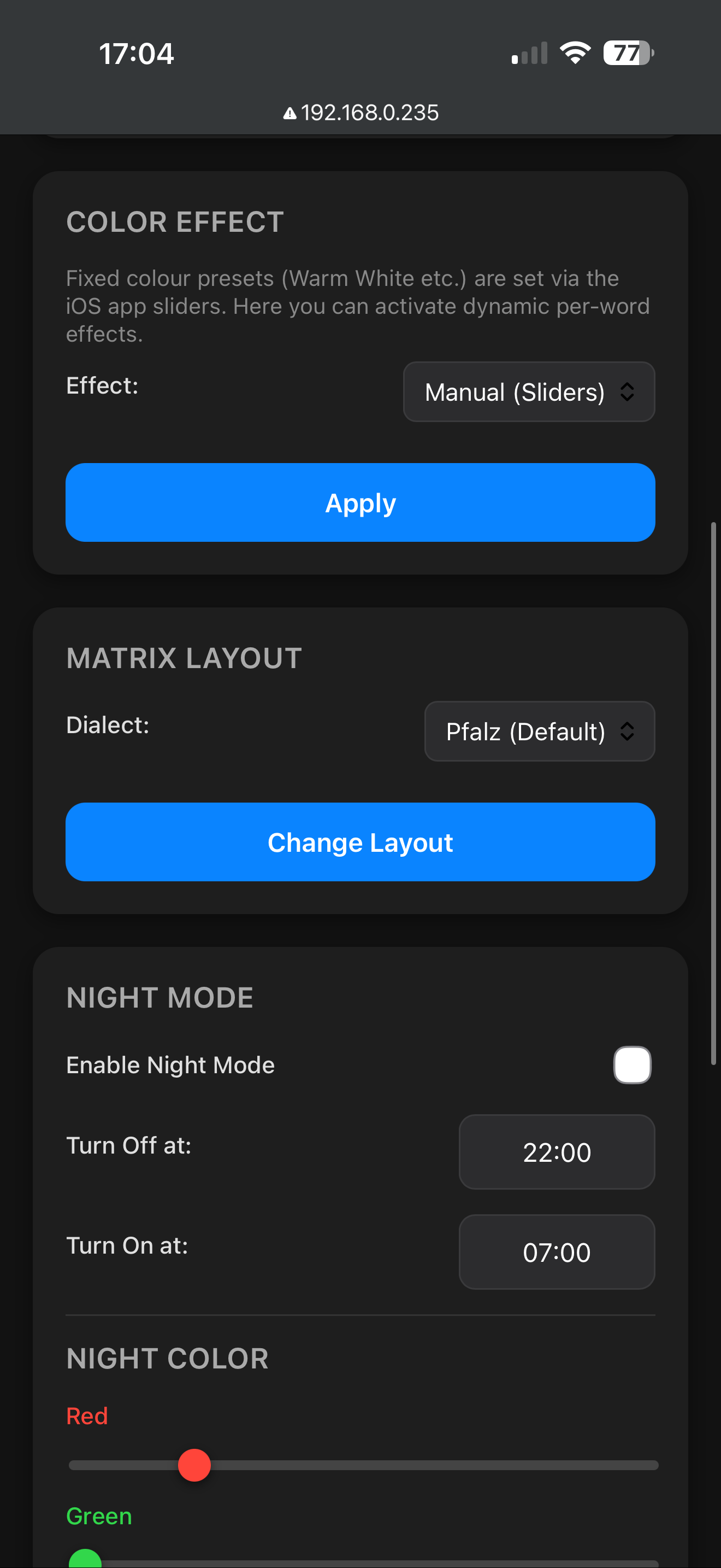 - Night Mode Color: Ein separates Set von RGB-Reglern. Wir empfehlen dringend, hier ein sehr tiefes, gedimmtes Rot einzustellen (z.B. R=50, G=0, B=0, Helligkeit=10%), um die natürliche Nachtsicht zu erhalten.