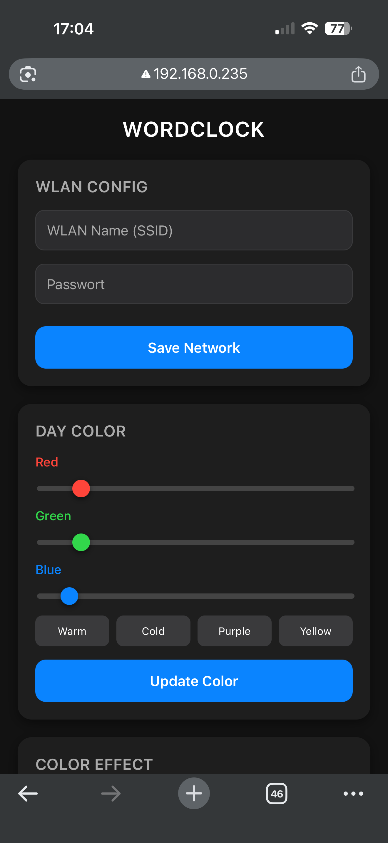 - Network Scan: Erkennt automatisch Uhren im selben WLAN-Subnetz. (ESP32 funktioniert sofort, ESP8266 nutzt UDP-Beacons).
